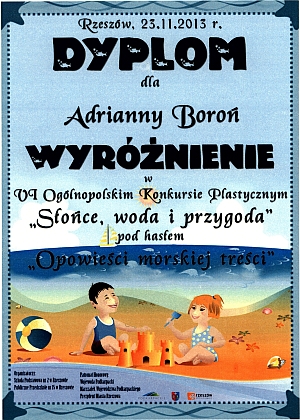 treści”. W konkurs udział wzięła uczestniczka zajęć plastycznych przy Ośrodku Kultury w Wiśniowej Adrianna Boroń, która została laureatką VI Ogólnopolskiego Konkursu Plastycznego "Słońce, woda i przygoda". Serdecznie gratulujemy!