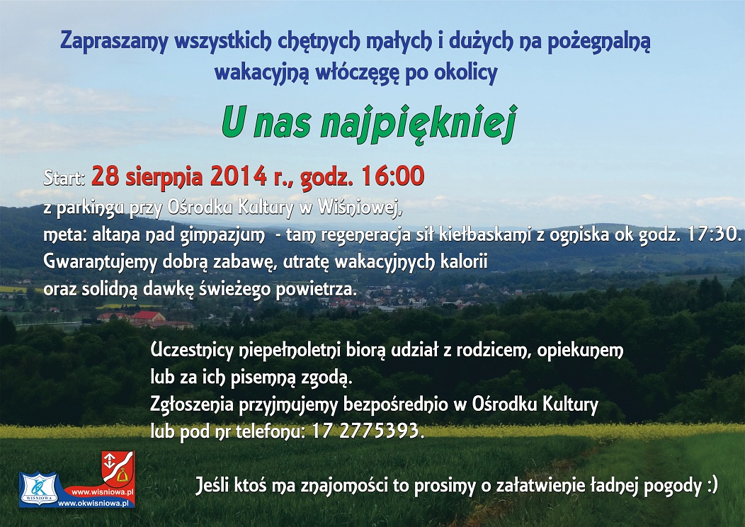 Ośrodek Kultury w Wiśniowej zaprasza wszystkich amatorów turystyki pieszej na pożegnalną wakacyjną włóczęgę po okolicy, która odbędzie się 28 sierpnia, start godzina 16.00.